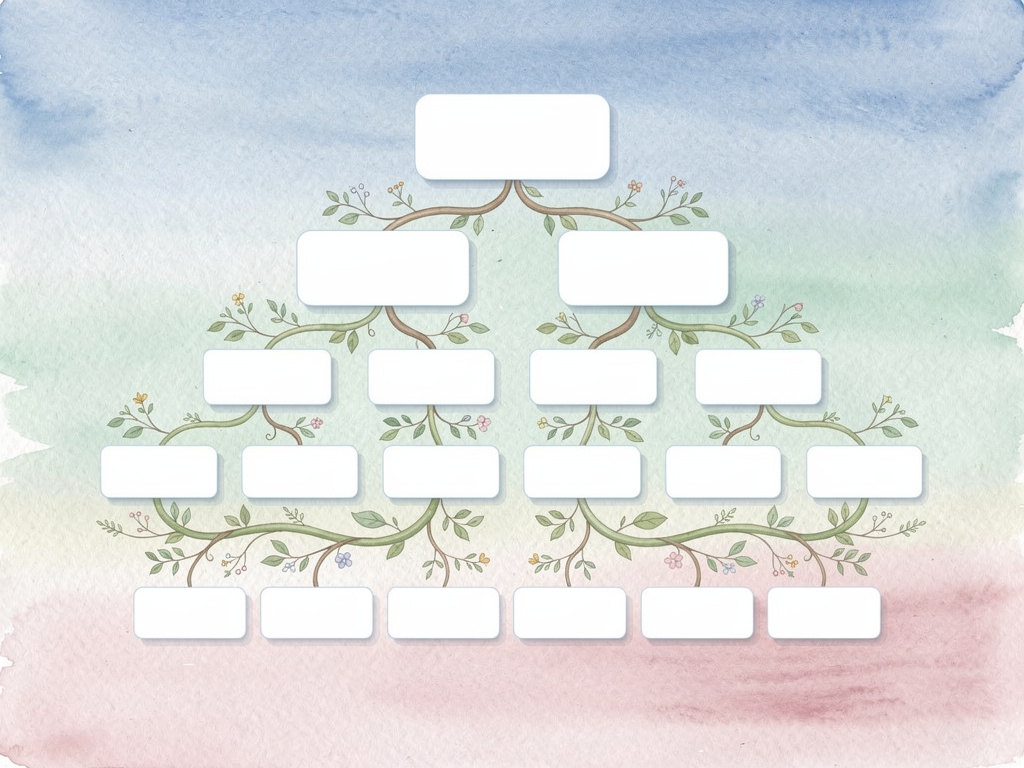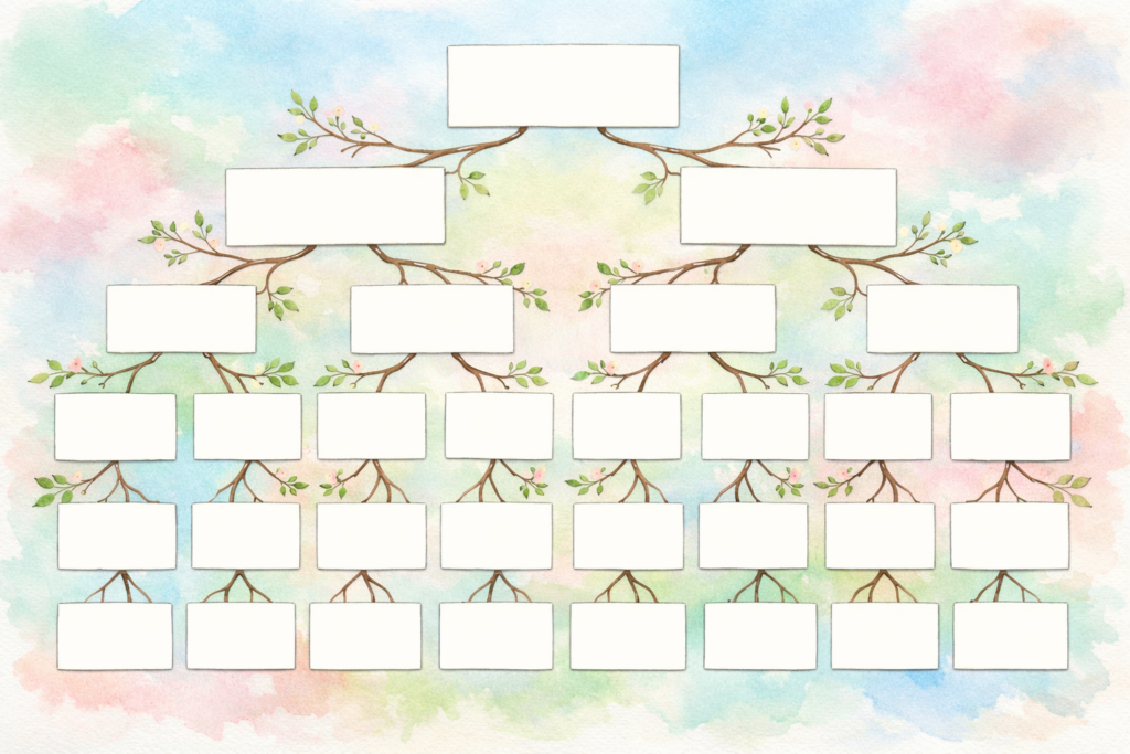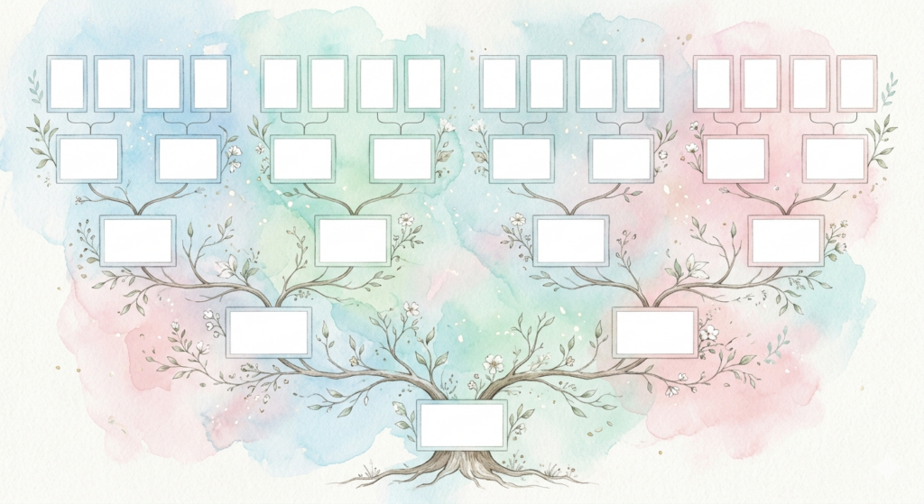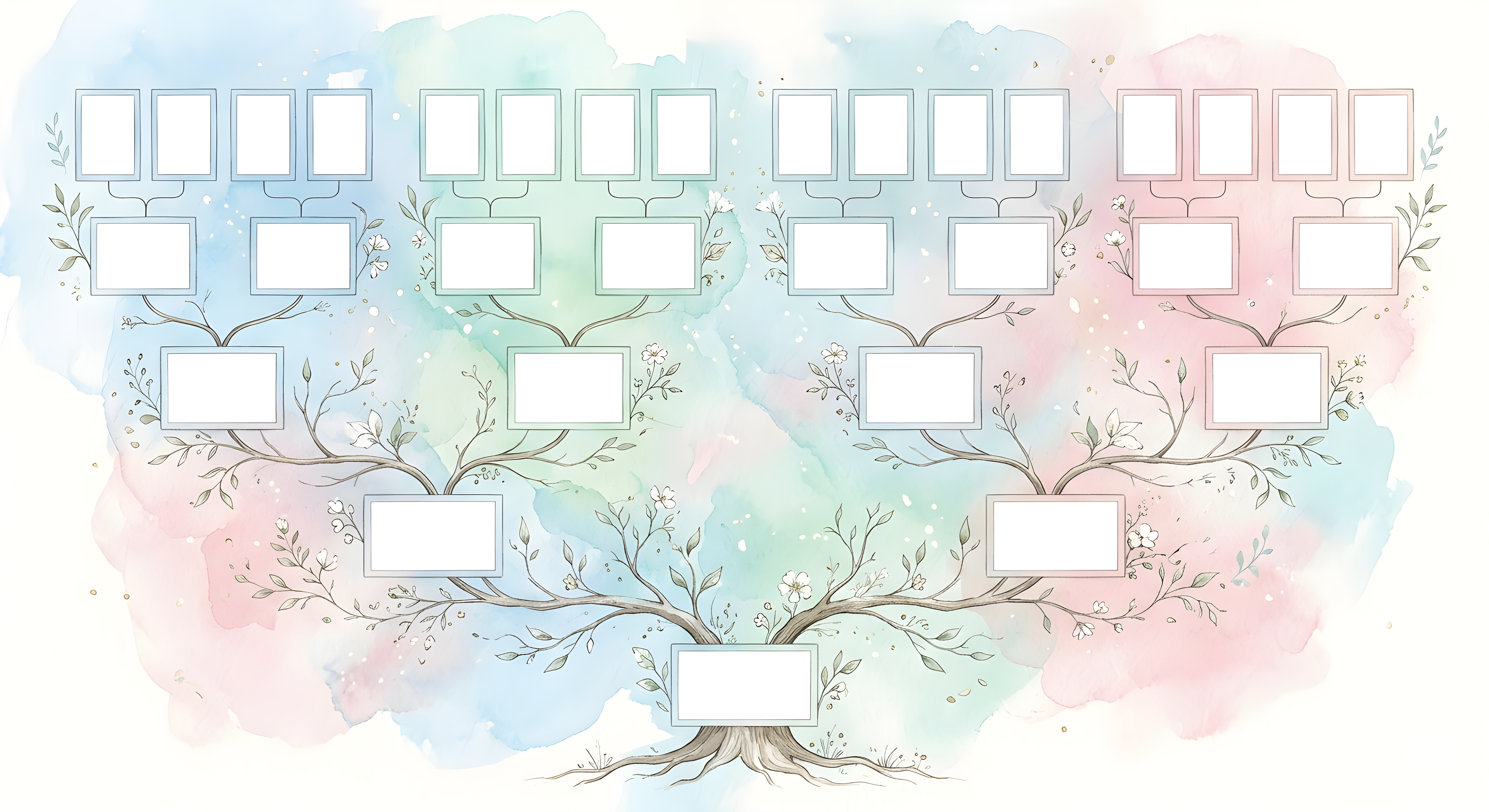 Le style doit être une aquarelle douce et artistique, avec un fond aux tons pastel (bleu ciel, vert menthe, rose poudré) et des effets de transparence. Les branches doivent être organiques, avec des détails de feuilles ou de fleurs discrètes pour une touche naturelle. Chaque case doit être suffisamment grande pour écrire des noms et dates à la main. L’ensemble doit être harmonieux, élégant et prêt à être imprimé en haute résolution.